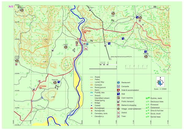 It also goes on to north parallel to Eşen River. Karaköy and from the other side of the bridge Kınık settlements can be seen. This is the first settlement which contains a bank or ATM access from Fethiye on the Lycia road. Across the bridge at the left side, if one goes on upside from the asphalt road from passing in the middle of the bazaar area Xhantos ruins can be seen. After the ruins the pathway goes on parallel to the asphalt road in the forest. Lycia road signs in this area were erased. When you go on to east parallel to the asphalt road, you can see the interurban road intersection.