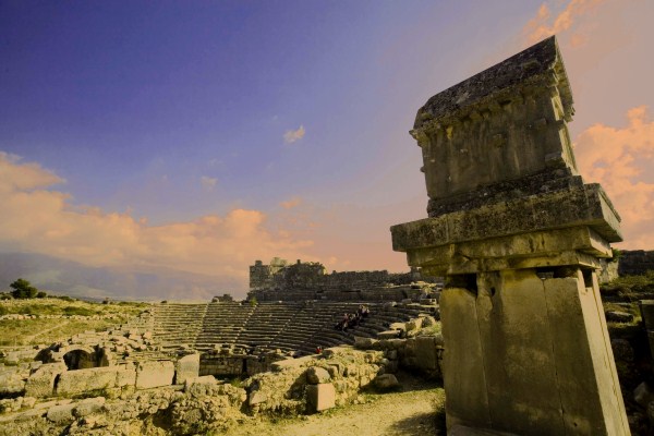 The mausoleum had set up on a high pedestal. In the underside of the mausoleum there are two rows of reliefs depicting a war scene and above the architectural parts on it, there is a triangle pediment which was held by four pillars. There are reliefs reflecting the war scenes placed in the pediment section. Since there is statues of Nereids which were sea nymphs between the pillars of the mausoleum this mausoleum was called “Monument of Nereids”. The Hellenistic parapets which were built in ancient times and supported by towers surround the Xhantos ancient city. Ancient Theater is located in acropolis. The theatre which was constructed in the Hellenistic period and renewed in Roman period has vaulted entrances in east and west sides. The theatre which has a semi-circle orchestra and an ornate scenery building is for 2200 people.